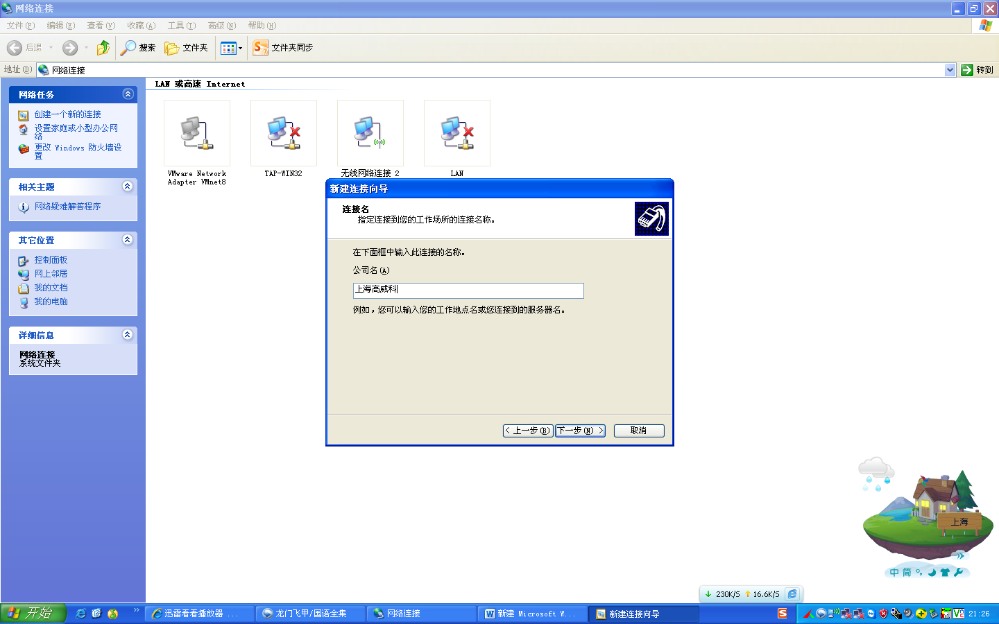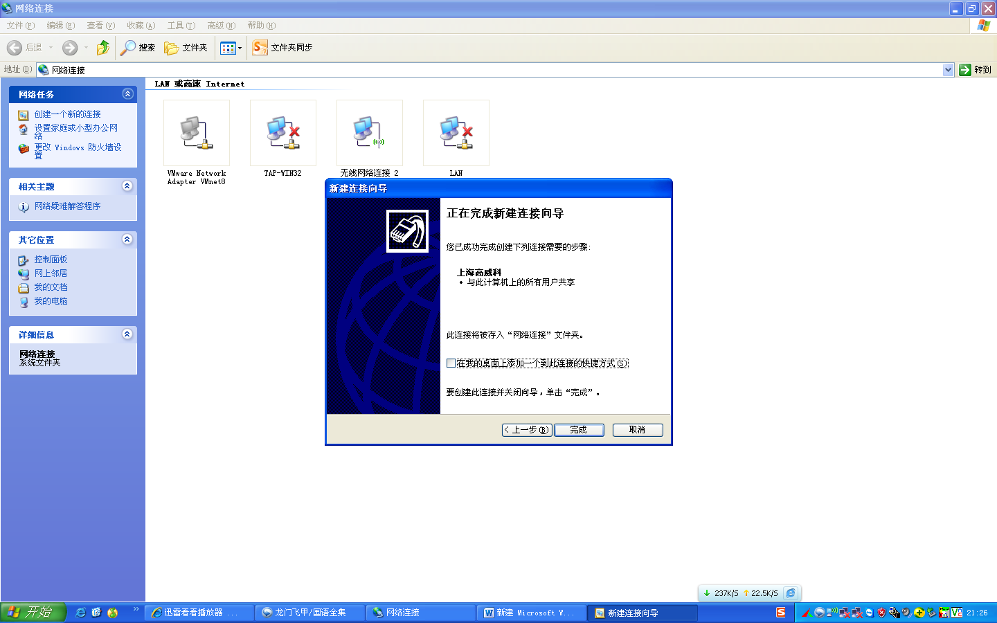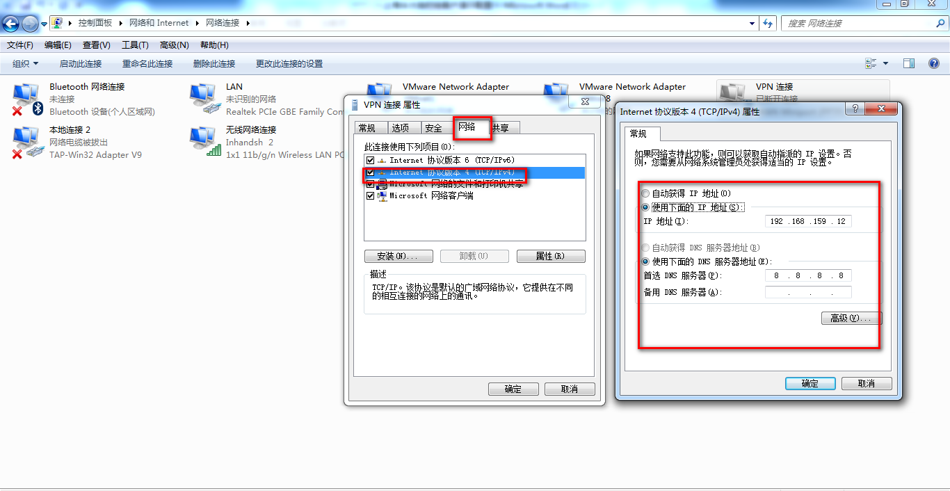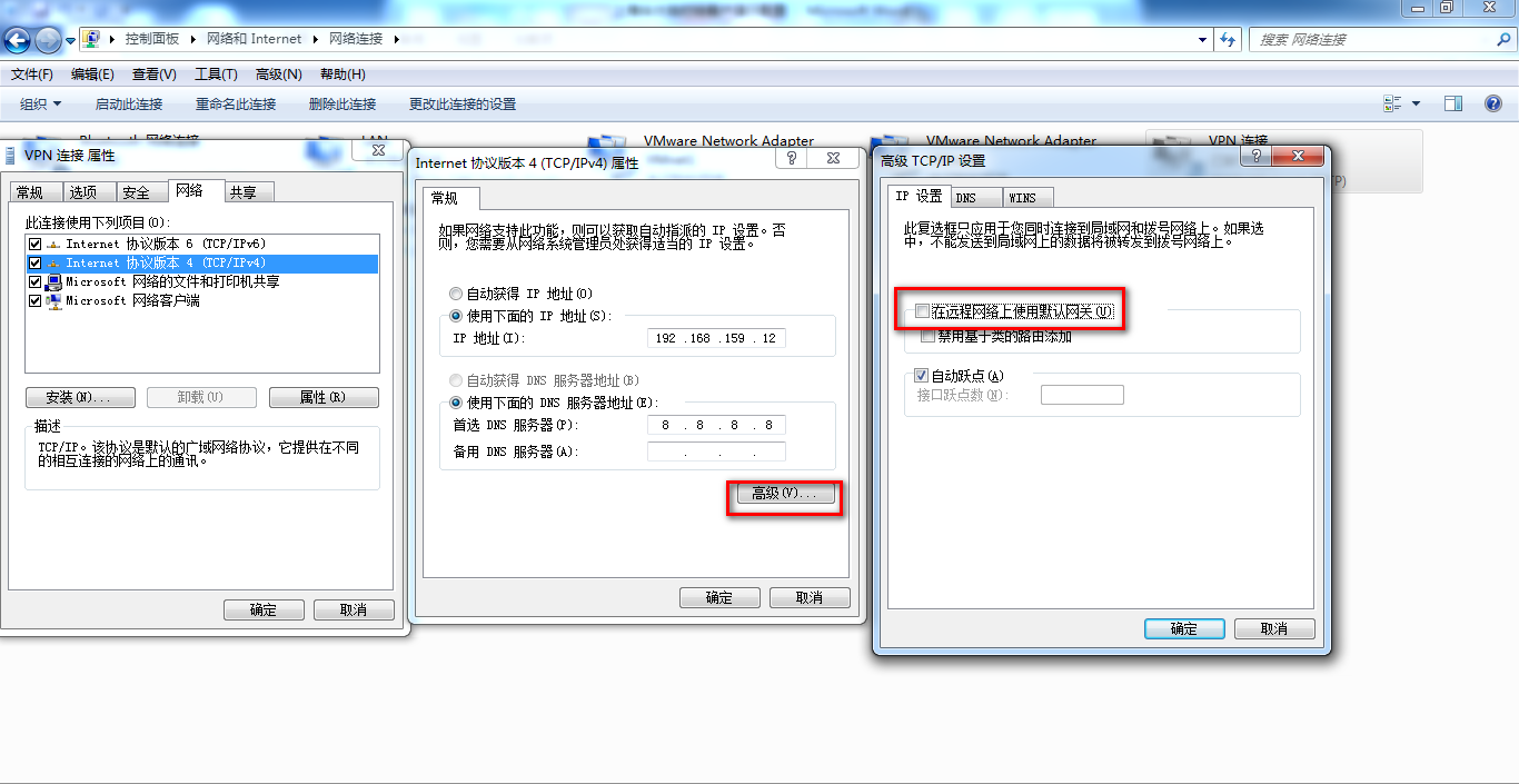 注意:下图中“IP设置”中“在远程网络上使用默认网关”不要打钩!