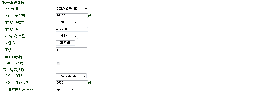 第二阶段参数:配置IPSec隧道在第一阶段协商时的参数。