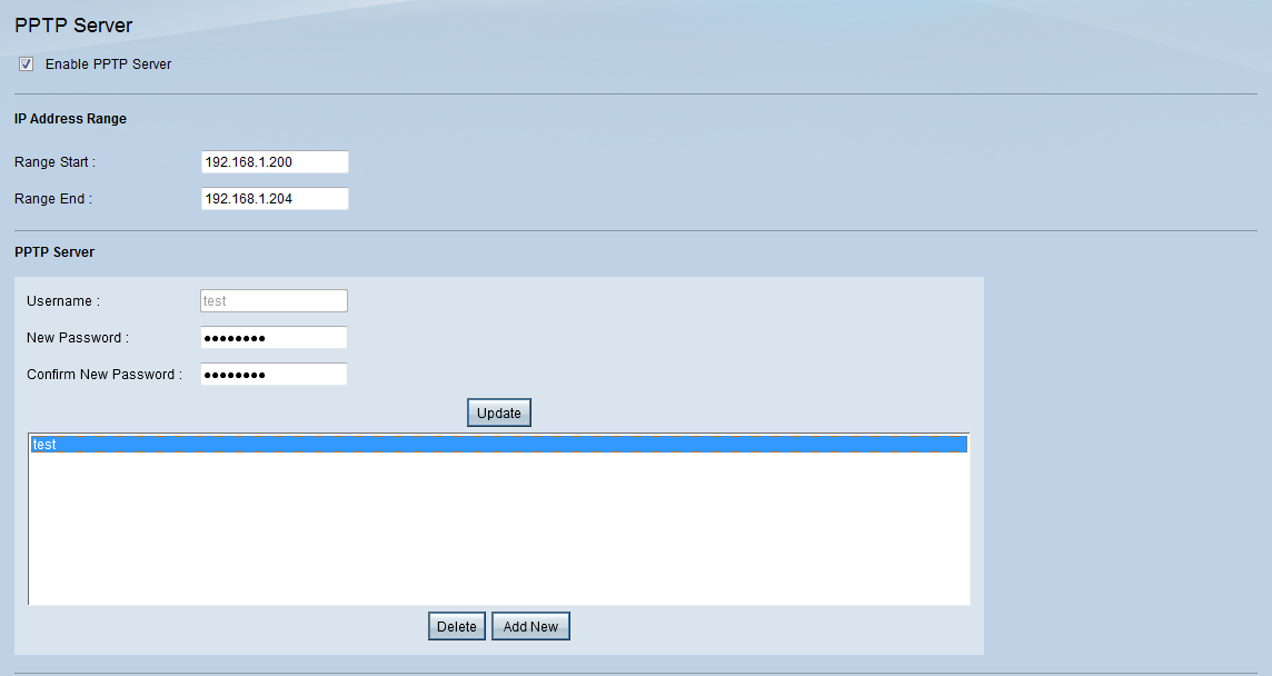 由于cisco rv042只能支持5个pptp 客户端连接,所以地址池也只能设定5个地址范围,比如下面例子;(地址池可自定义设定;)