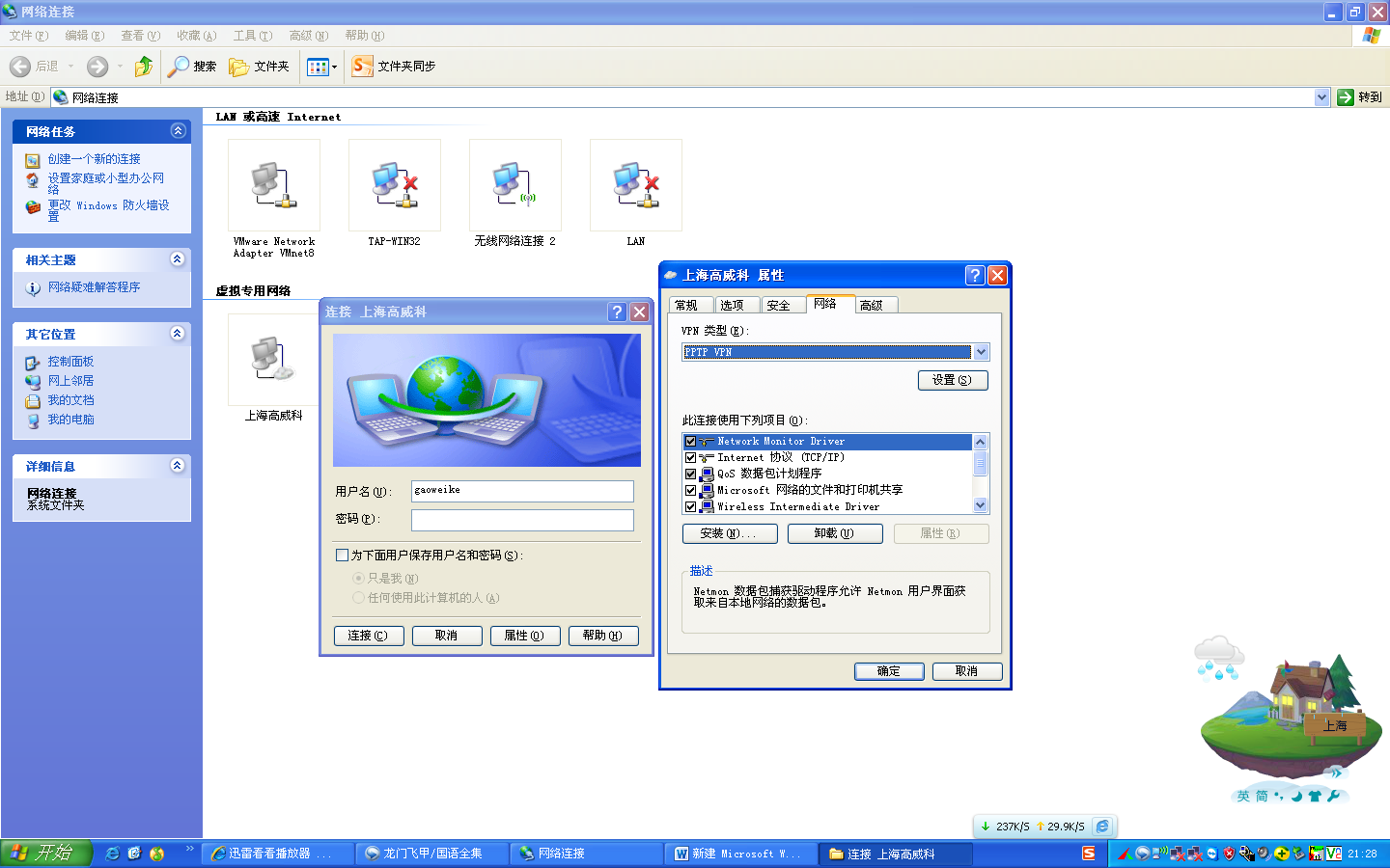 输入cisco端设定pptp server时创建的用户名和密码,点击“属性”-“安全”-“高级(自定义配置)”-“设置”,数据加密选择“可选加密”;最后点击确定;