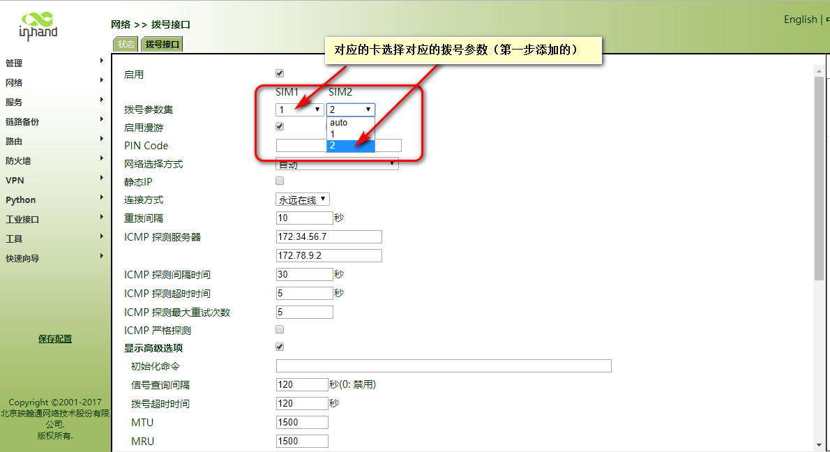 第二、给对应的卡选择对应的拨号参数: