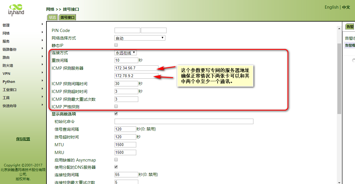 ICMP探测参数: 探测时间30s 超时时间3s 探测次数3次 //第1次探测是拨号成功30s,若不成功3s后探测第2次,36s后探测不成功重启拨号模块。