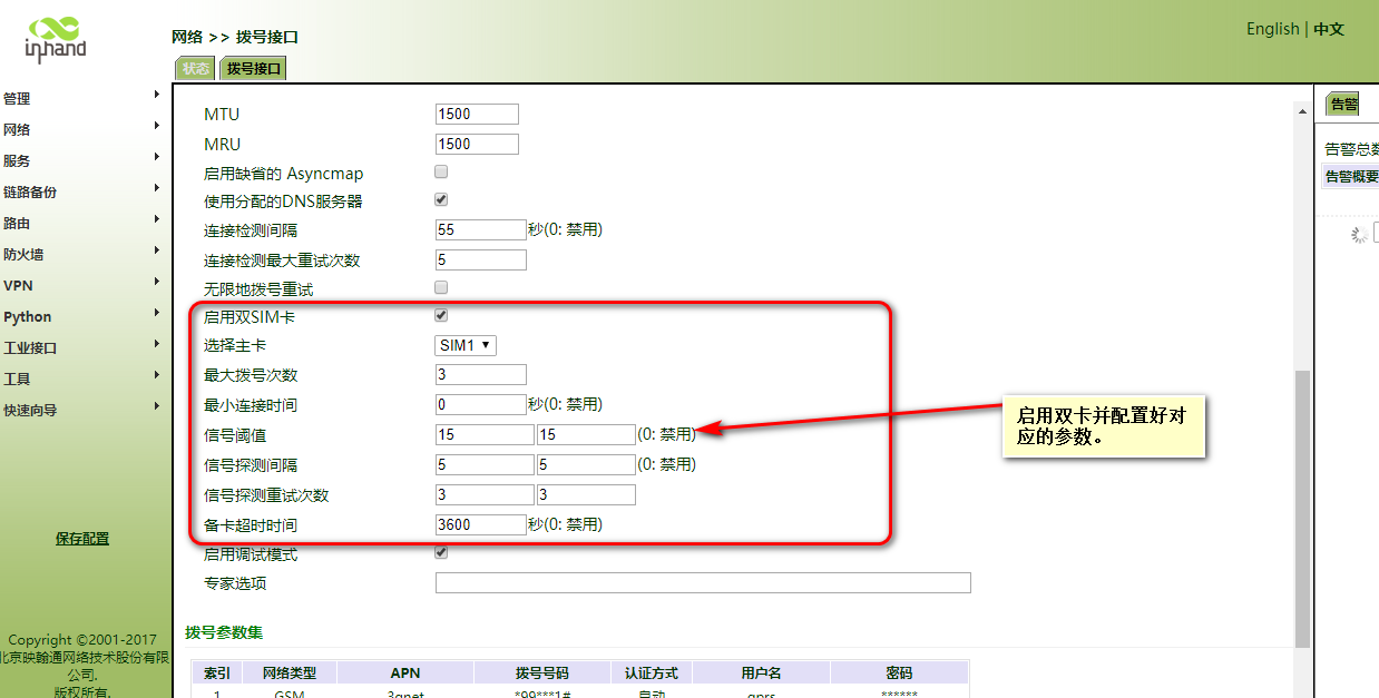 第三、启用双卡并配置好对应的参数: