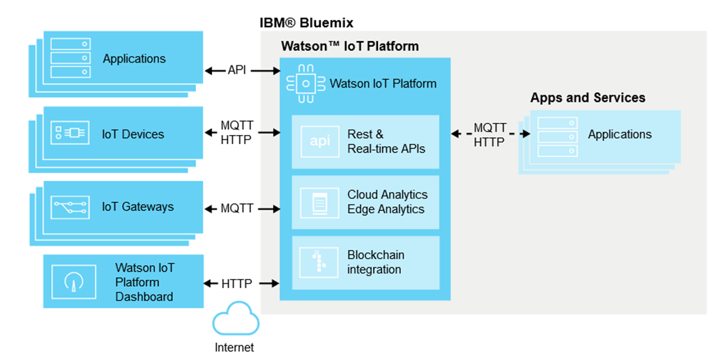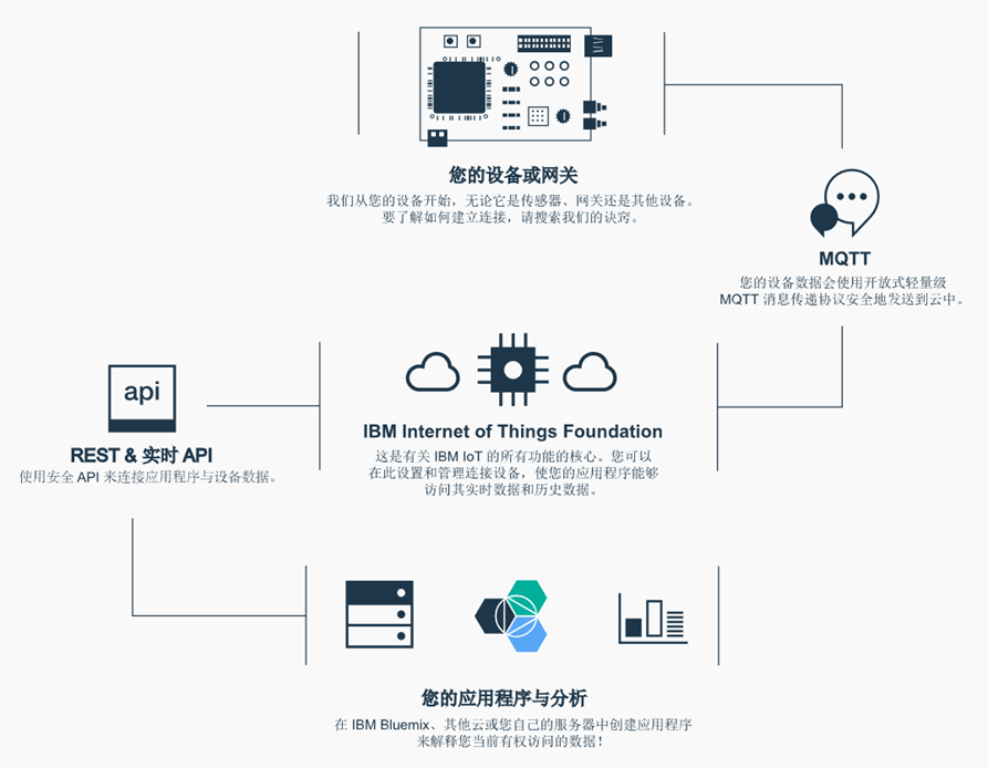 平台通过使用 MQTT 和 TLS,提供与设备之间的安全通信。Watson IoT平台使应用程序与已连接的设备、传感器和网关进行通信并使用由它们收集的数据。应用程序可以使用实时 API 和 REST API 来与设备进行通信。
