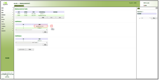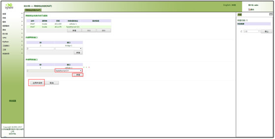 在内部网络接口删除fastethernet 0/1后在“外部网络接口”中新增fastethernet 0/1,点击<应用并保存>,如图所示。
