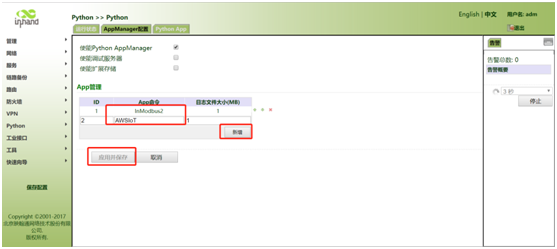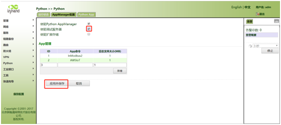 进入python--AppManager配置页面配置APP运行:在APP命令中添加APP名称,添加后点击新增,随后点击应用并保存。(建议直接在运行状态页面复制APP名称并粘贴至AppManager配置)