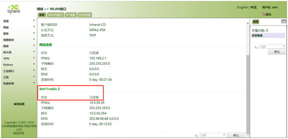当dot11radio 2状态为已连接时说明连接wifi成功
