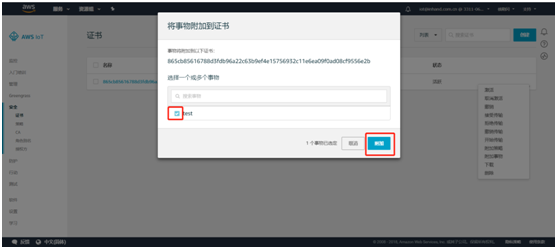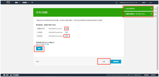 创建完成后提示事物和证书创建成功。需要下载事物的证书和私有秘钥并激活证书,之后点击完成。