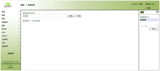 打开“管理>>系统升级”界面,如图所示。此处显示的固件版本为当前固件版本;选中升级文件,点击<升级>并在升级完成后重启网关。