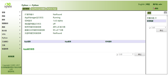 第二步:点击“Python>>运行状态”,可在“运行状态”界面查看python相关信息及SDK版本,“运行状态”如图所示。