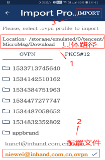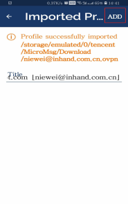 OpenVPN安卓手机连接方式 阚成龙 这家伙很懒,还没有设置简介 1 人点赞了该文章 · 19852 浏览 安卓手机OpenVPN连接ics.inhandiot.com具体流程。流程文档和手机APP查看附件。 一.在ics.inhandiot.com下载配置文件,并传输至手机 二.安装OpenVPN手机客户端并打开,选择.ovpn文件连接 三.选择配置文件 四.添加账号 五.选择连接的账号 六.确认连接