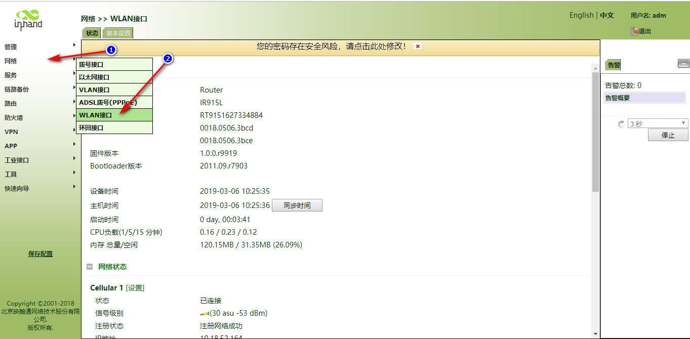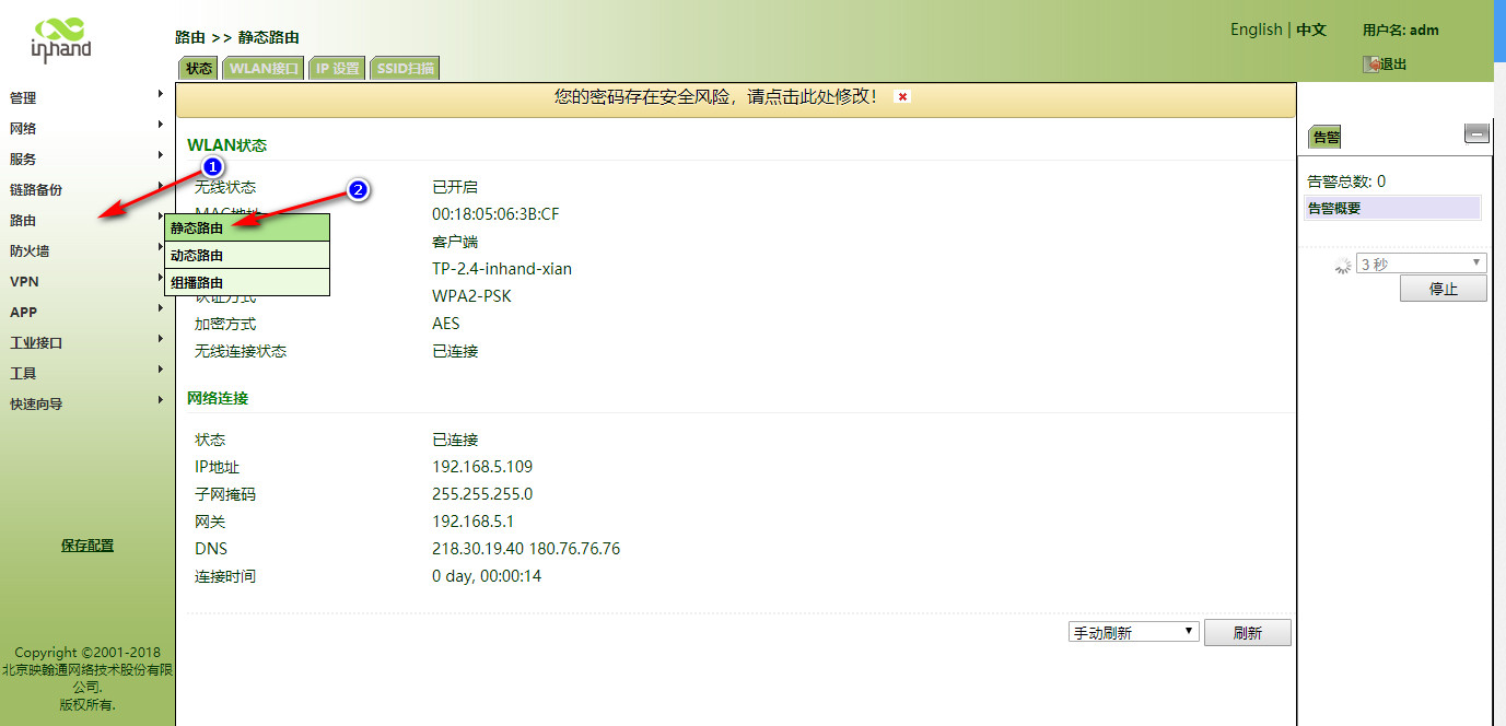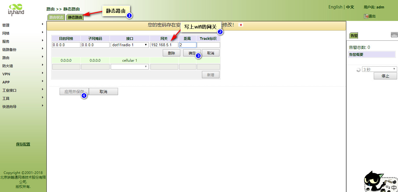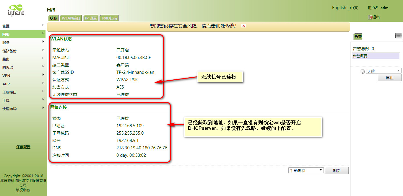 怎样使用IR900连接WiFi上网呢?? 奇兵 这家伙很懒,还没有设置简介 1 人点赞了该文章 · 3468 浏览 1、登录网关。 2、开启网关的DHCP客户端(默认开启)。 3、开启WLAN客户端功能。 4、填写要连接的WIFI信息。 5、查看连接情况 6、写静态路由。 7、设置防火墙 8、WiFi的DHCPserver没有开启的话继续向下执行,如果上边的已经测试可以通,则不需要执行下边的操作。