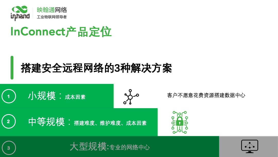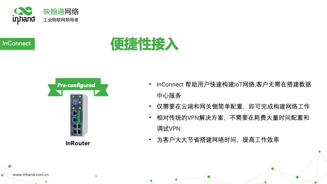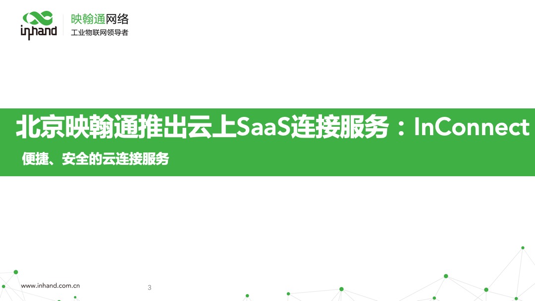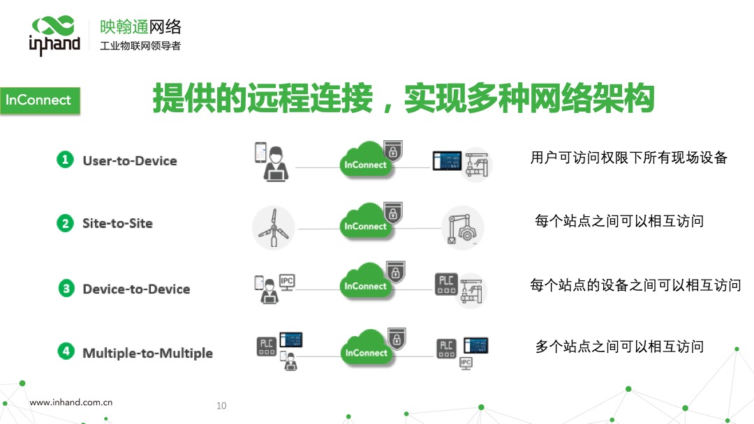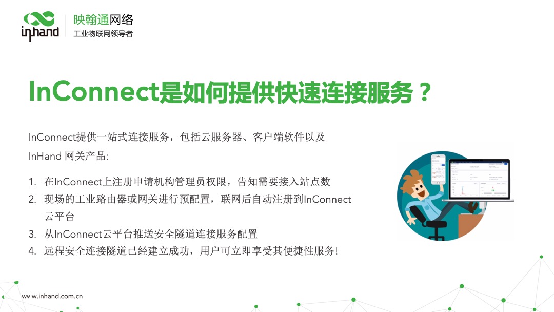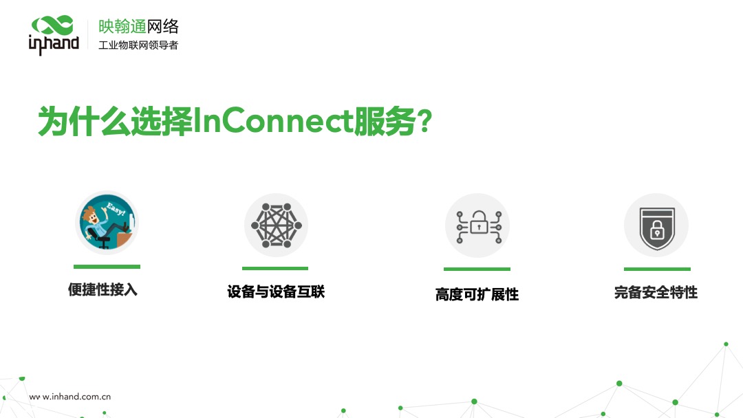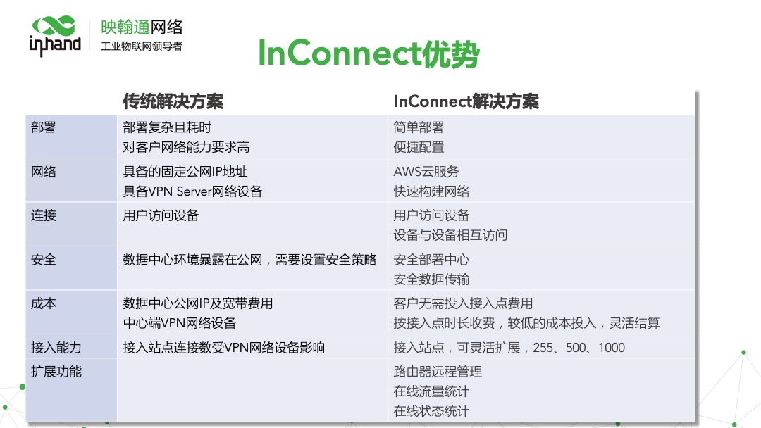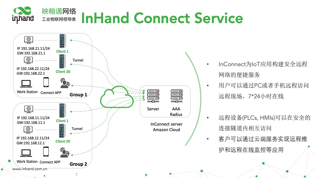 InHand Connect Service是简称 InConnect 可以实现快速异地组建虚拟局域网,该方案基于 SaaS(Software as a Service)服务,具有即插即用,端对端、易扩展、数据加密传输等特点。