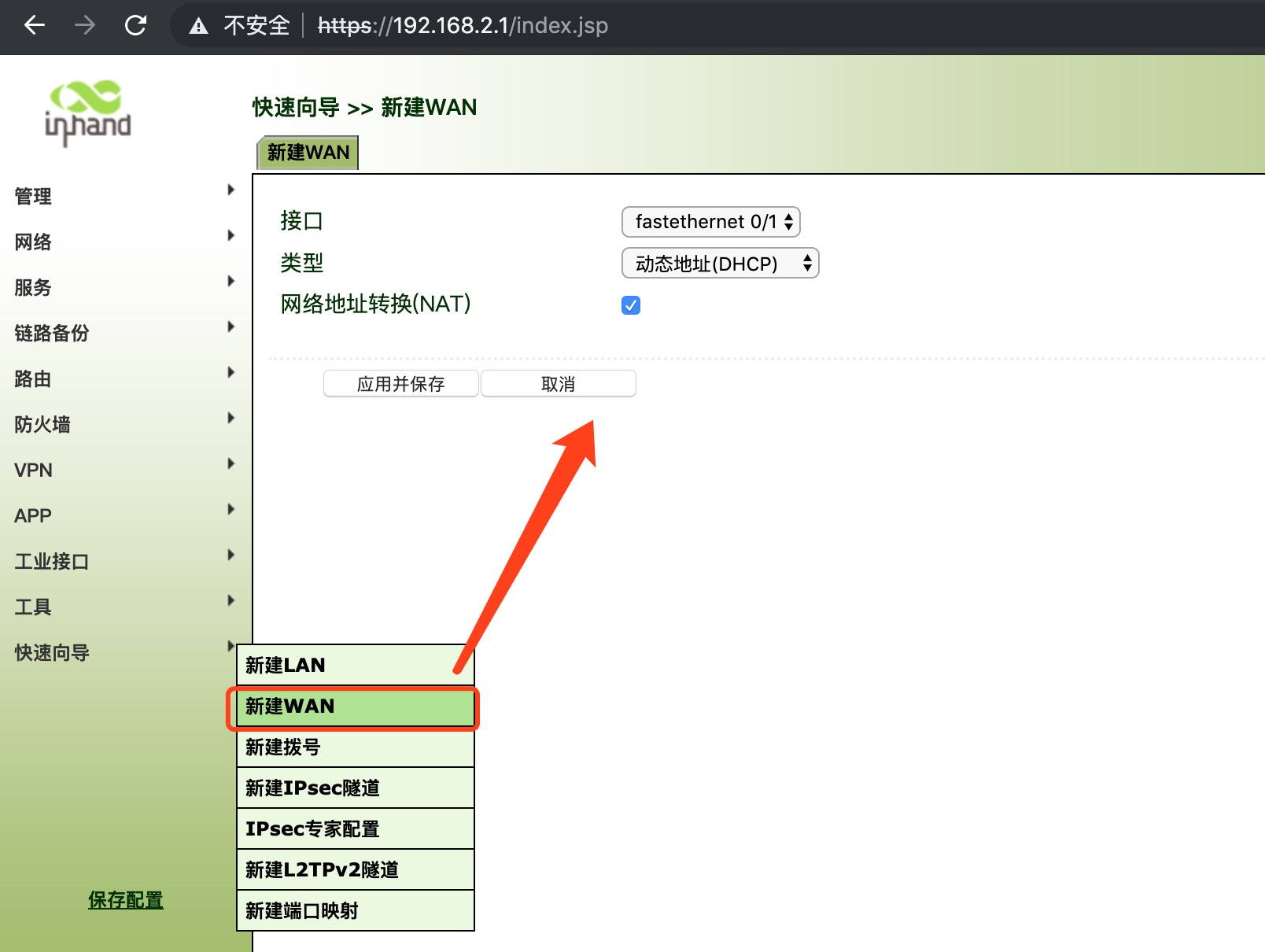 接口选择 fastethernet0/1 ,类型:动态地址(DHCP),配置完毕点击应用并保存。