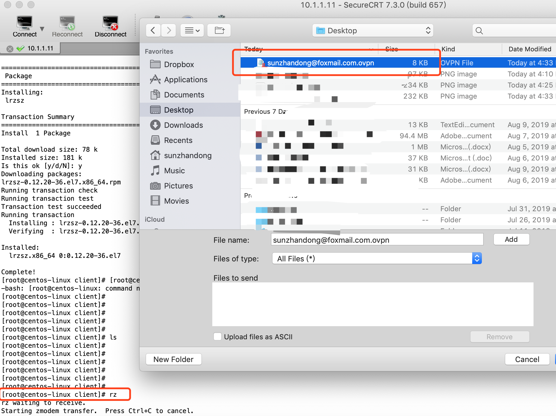 ps: 我登陆服务器是使用的CRT,使用ssh传输文件得安装lrzsz工具,通过rz 命令从本机将文件传给Centos系统下。[root@centos-linux client]# yum install lrzsz [root@centos-linux client]# cd /etc/openvpn/client/ [root@centos-linux client]# rz配置文件被成功上传