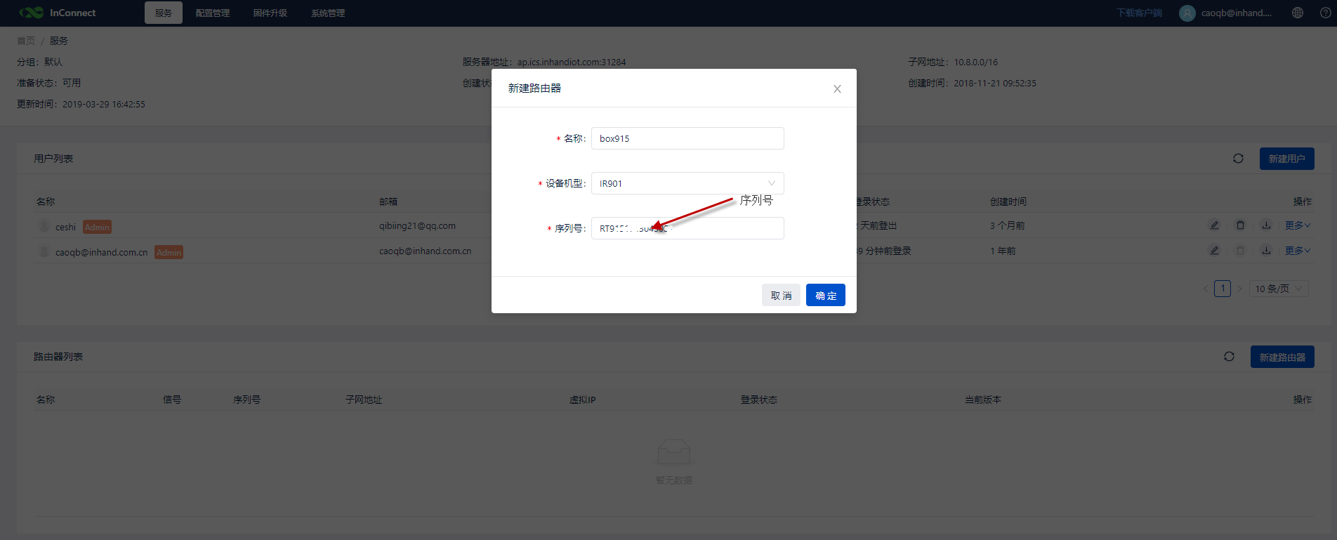 4、登录ics.inhand.com.cn,根据序列号添加网关: