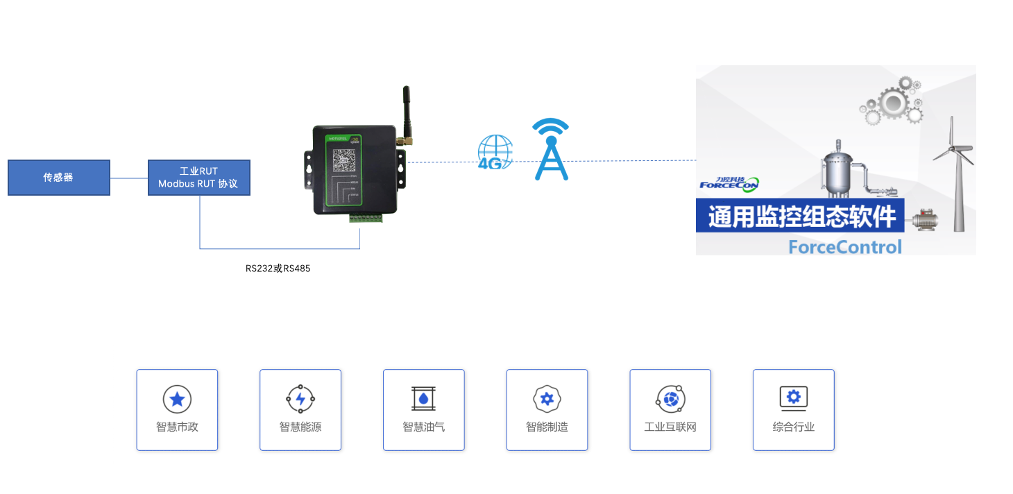 本文主要的内容是InDTU配置位DCTCP的连接方式,连接力控ForceControl V7.2的配置。DTU下端连接Modbus RTU 协议的通讯协议设备,通过4G网络通讯。安装力控的服务器需要具备公网IP地址。