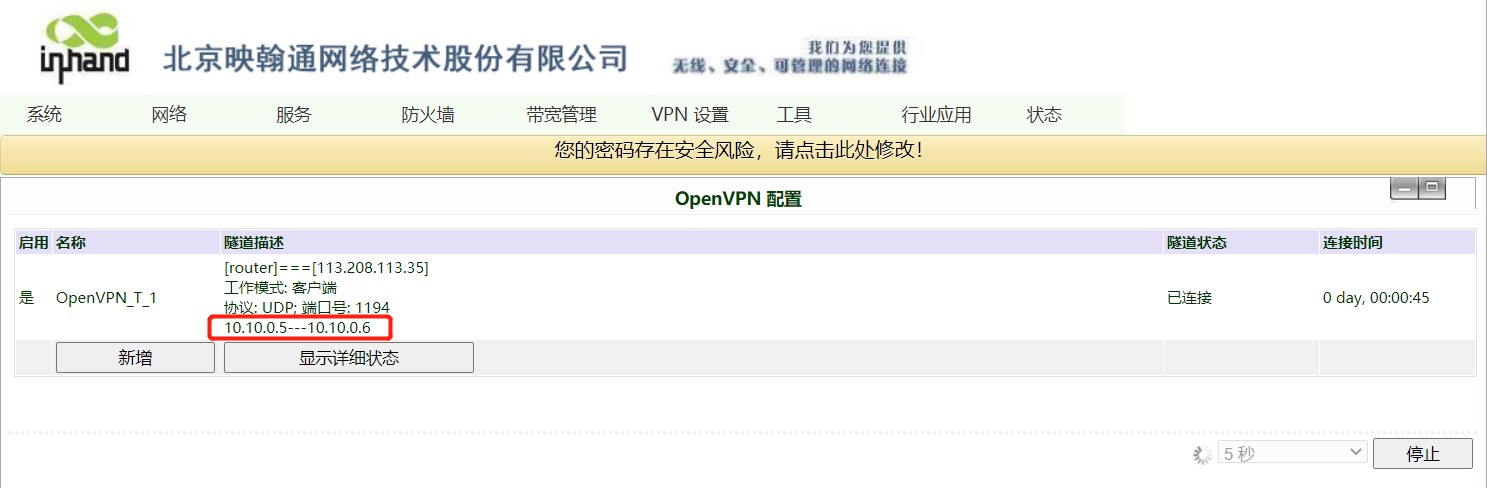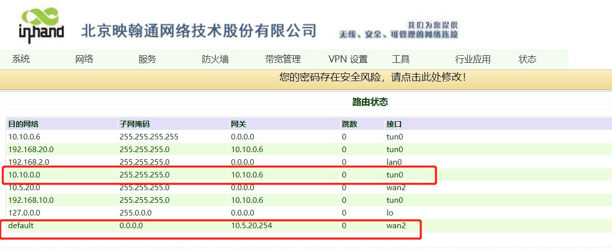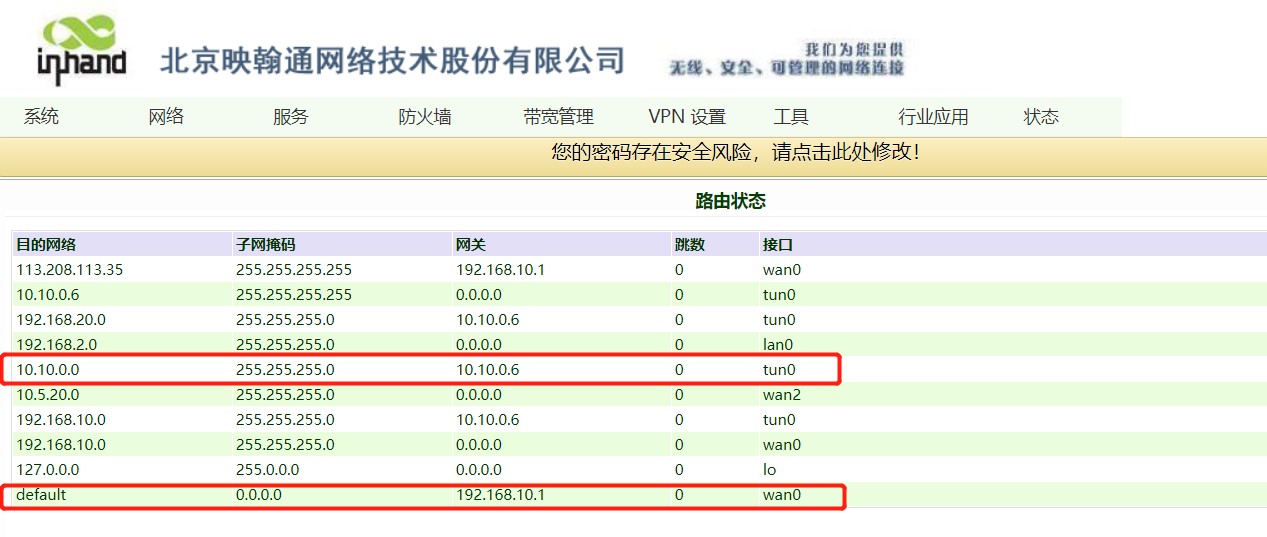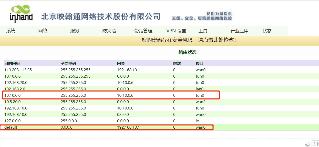 4. 设置完成后查看路由表,可以看到数据通过WAN口路由,并且openvpn已经建立连接。