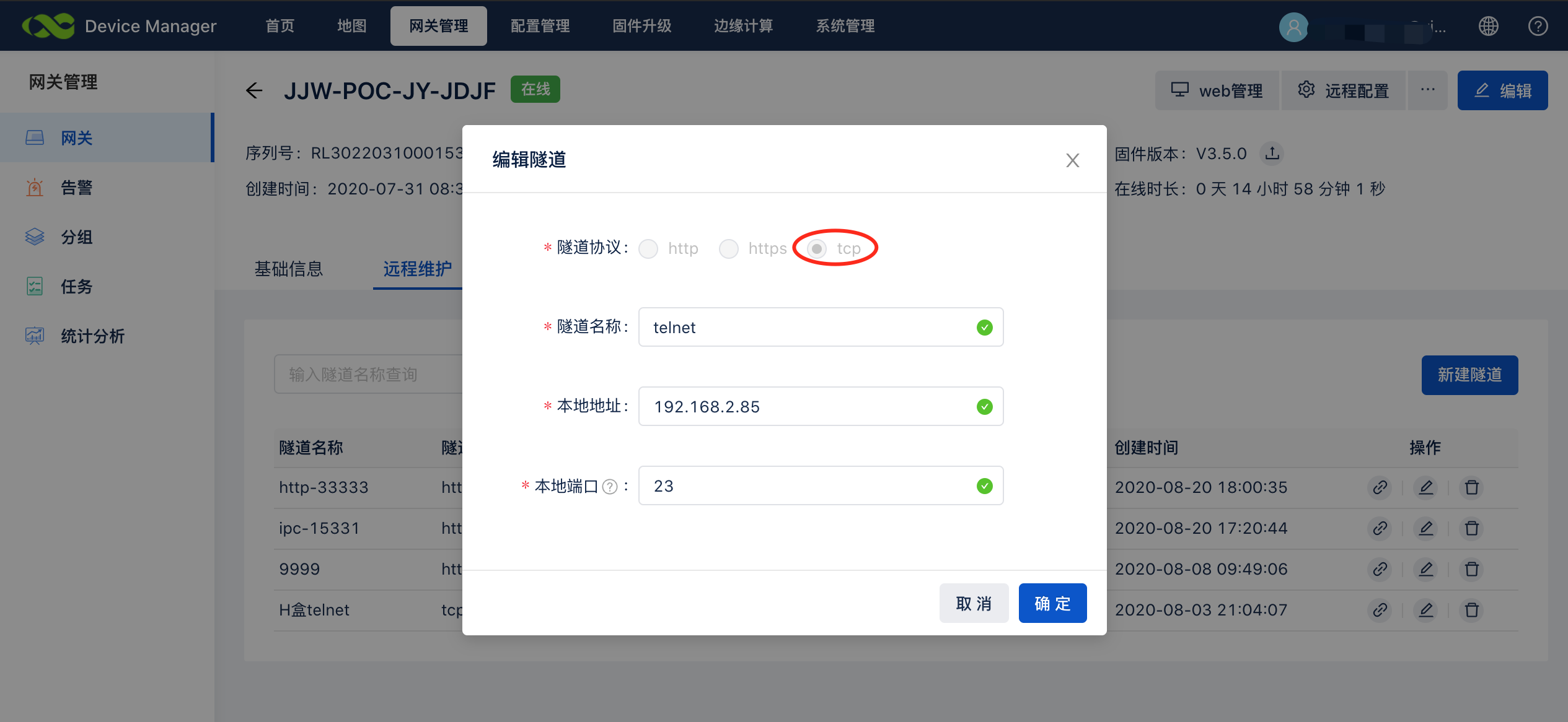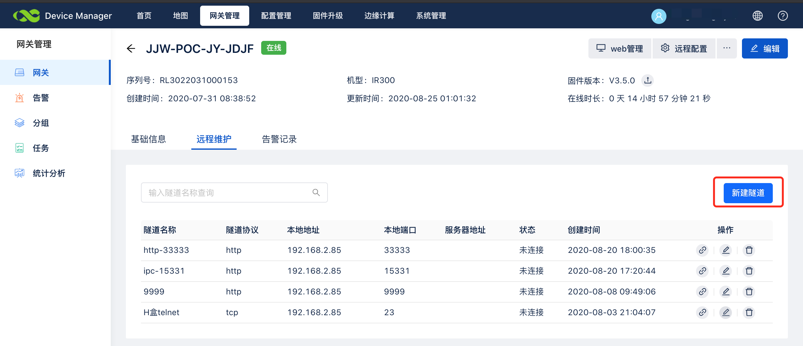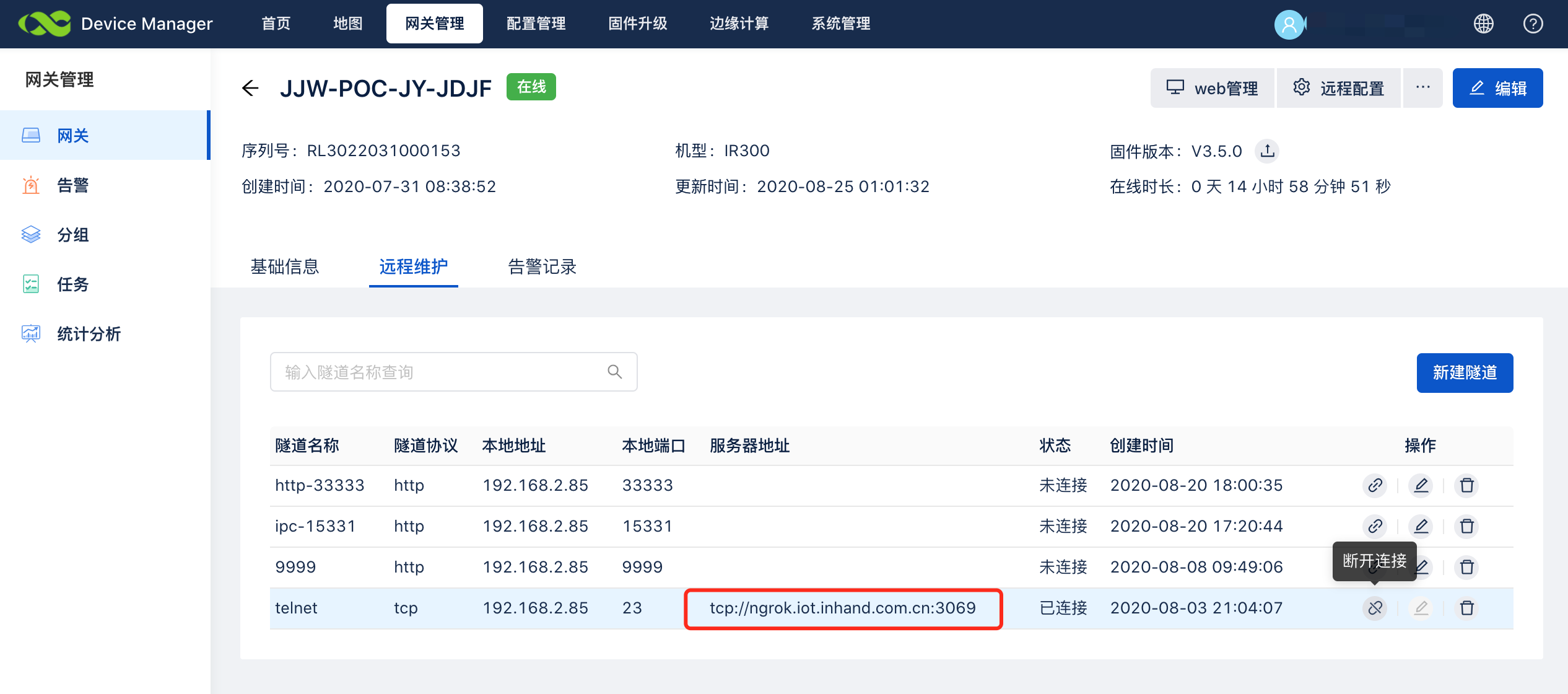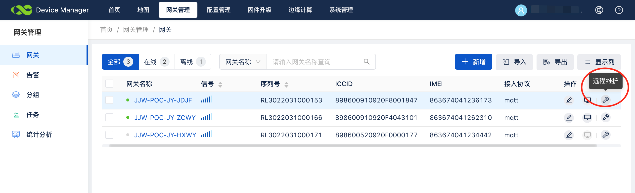 进入网关列表,点击“远程维护”进入配置页面