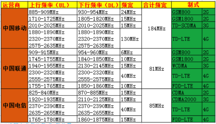 中国移动联通电信 2G/3G /4G 无线网络频率分配现状