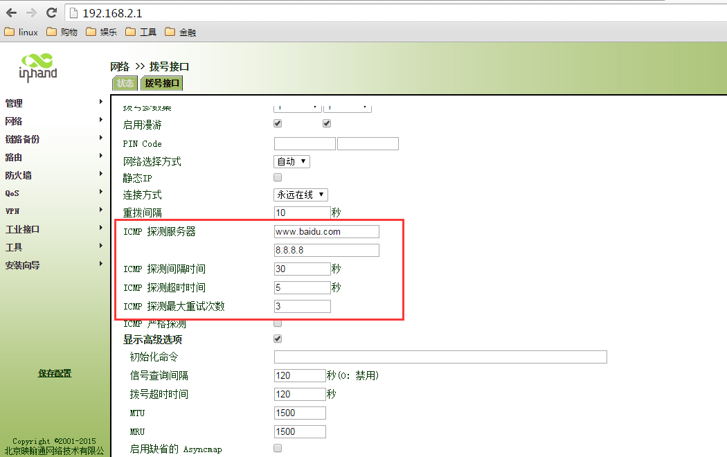 ICMP探测参数: 探测时间30s 超时时间3s 探测次数3次 //第1次探测是拨号成功30s,若不成功3s后探测第2次,36s后探测不成功重启拨号模块。