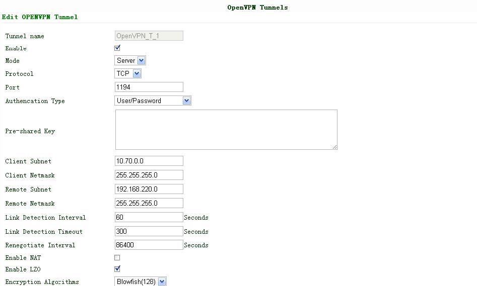 1. Entering the server’s web, click “VPN”????”OpenVPN Advanced” and change the settings