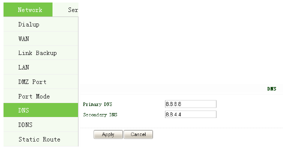 Click “Network”????”DNS”, configure as below and then click “Apply”: