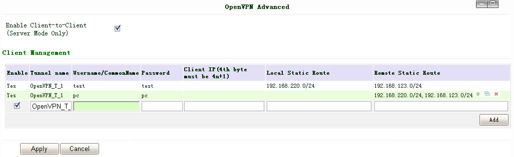 Enable Client-to-Client (Server Mode Only), and click “Add” to add this tunnel setting: