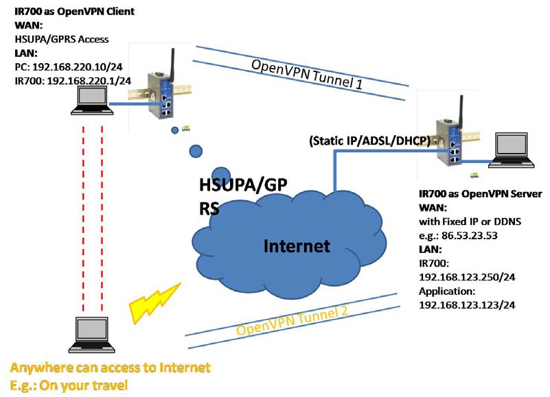2) For OpenVPN Server, IR700 must be with fixed IP or dynamic public IP with DDNS;