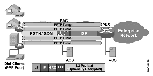 4. 使用MPPE加密PPP数据包,这些数据包接下来通过enhanced GRE封装,并在IP网络上传输