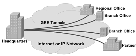 由于GRE是建立点对点的隧道,如果要多个端点的网状互联,则必须采用这种Hub-and-spoke的拓扑形式