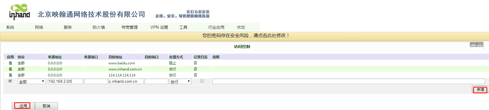 2、“防火墙”~“访问控制”,增加允许访问的网站地址,以允许192.168.2.0/24 网络内主机访问c.inhand.com.cn为例,来源地址填写192.168.2.0/24,目的地址填写c.inhand.com.cn ,处理方式选择“允许”。点击新增。
