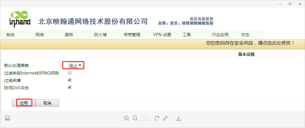 1、“防火墙”~“基本设置”,默认处理策略设置“阻止”。