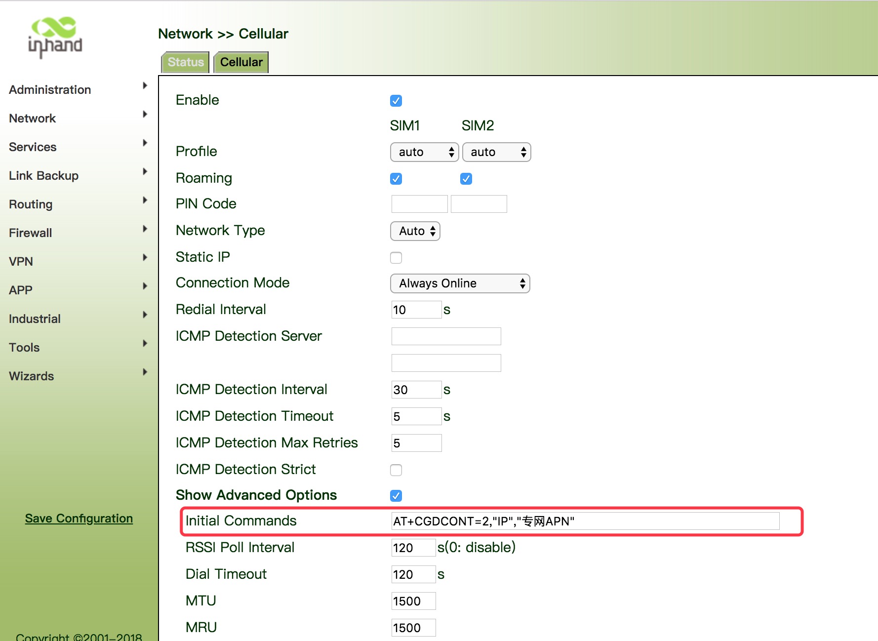 目前在使用IR900(包括IR912L-TL00和915L-TL00)时,若遇到使用电信4G专网卡拨号拨不上的时候,可参照以下解决方法: